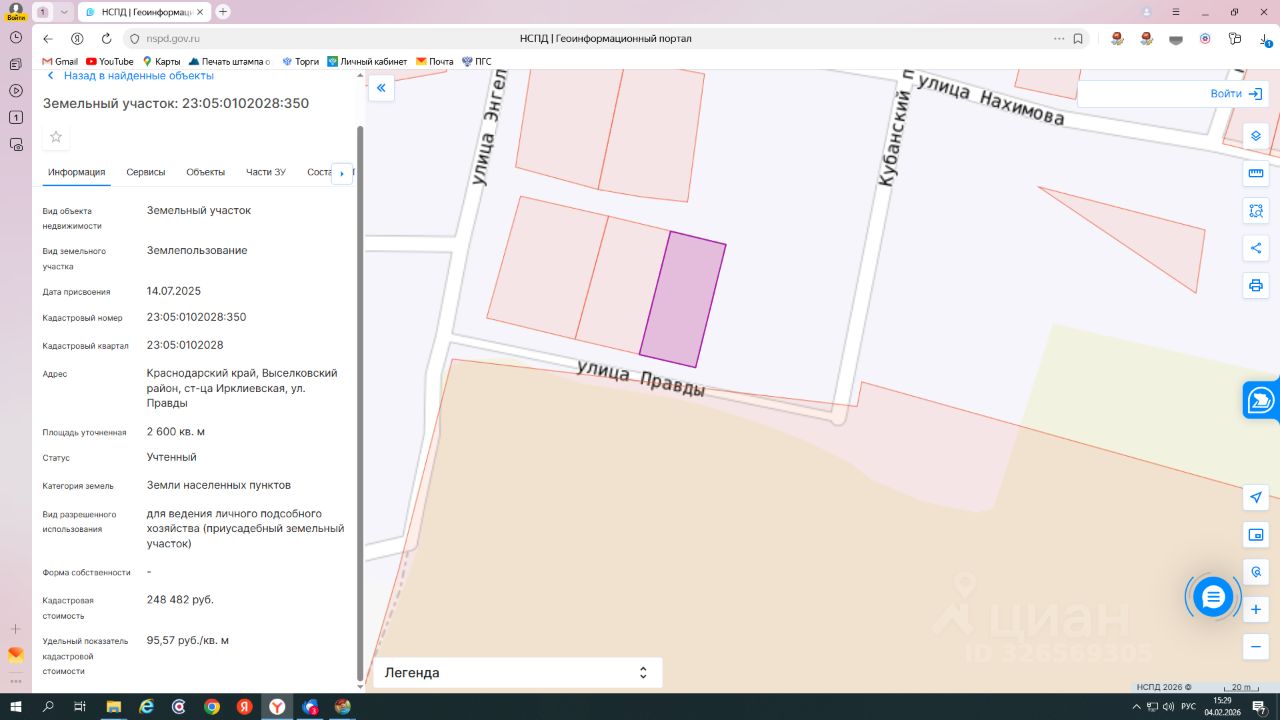 земельный участок с кадастровым номером 23:05:0102028:350, находящийся в государственной собственности, категория земель - земли населенных пунктов, площадью 2600 кв. м, расположенный по адресу: Краснодарский край, Выселковский район, ст-ца Ирклиевская, ул. Правды, вид разрешенного использования: для ведения личного подсобного хозяйства (приусадебный земельный участок)