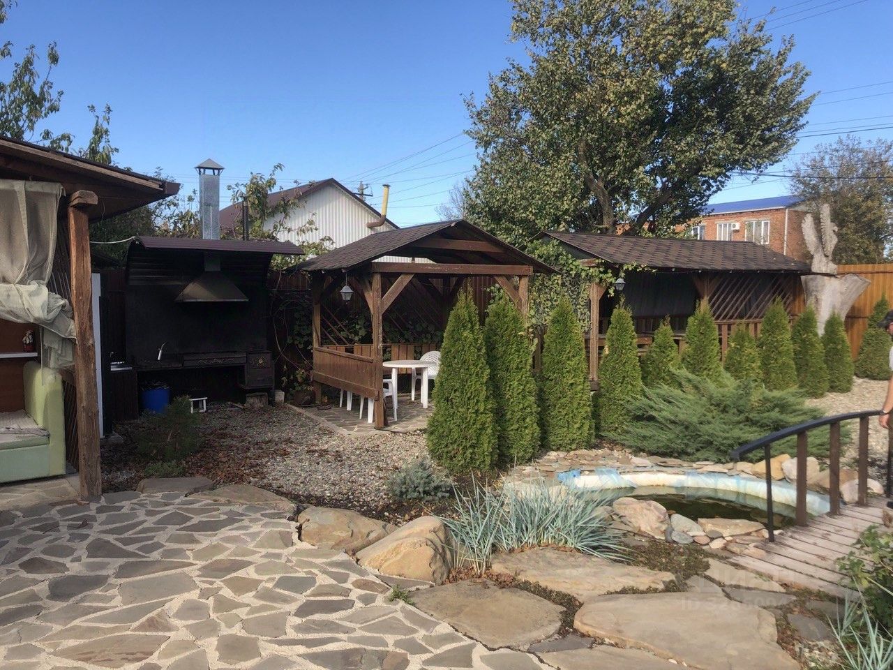 На участке есть 3 беседки, вместимостью 6, 8 и 17 человек. Возле беседок есть мангальная зона.