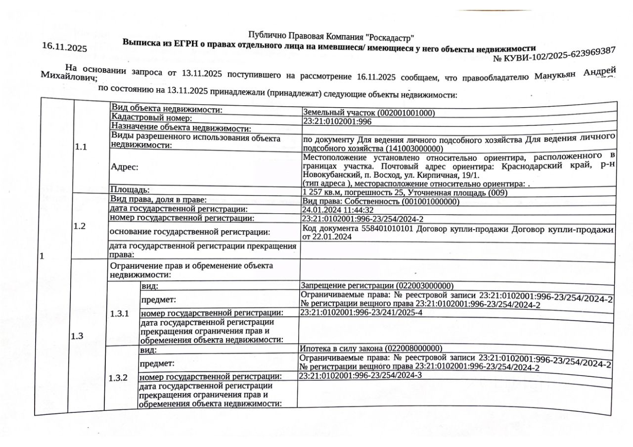 Д-к: Манукьян А.М. Земельный участок (для ведения личного подсобного хозяйства), площадь 1257 кв.м., кадастровый номер 23:21:0102001:996. Адрес: Краснодарский край, Новокубанский район, п. Восход, ул. Кирпичная, 19/1. Начальная цена 465 300 руб., задаток 466 руб., шаг аукциона 4 653 руб., ув. 1957