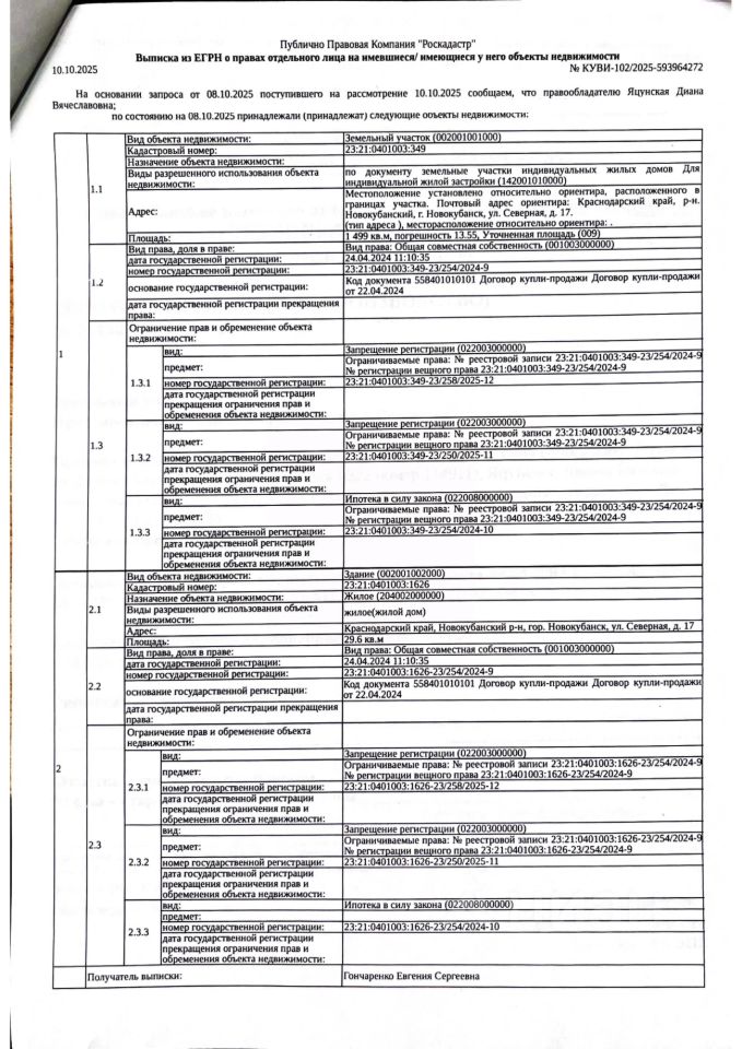 Д-к: Яцунская Д.В. Жилой дом, площадь 29,6 кв.м., кадастровый номер 23:21:0401003:1626, земельный участок (для индивидуального жилищного строительства), площадь 1499+/-13 кв.м., кадастровый номер 23:21:0401003:349. Адрес: Краснодарский край, Новокубанский район, г. Новокубанск, ул. Северная, д. 17. Начальная цена 1 518 400 руб., задаток 1 519 руб., шаг аукциона 15 184 руб., ув. 1963