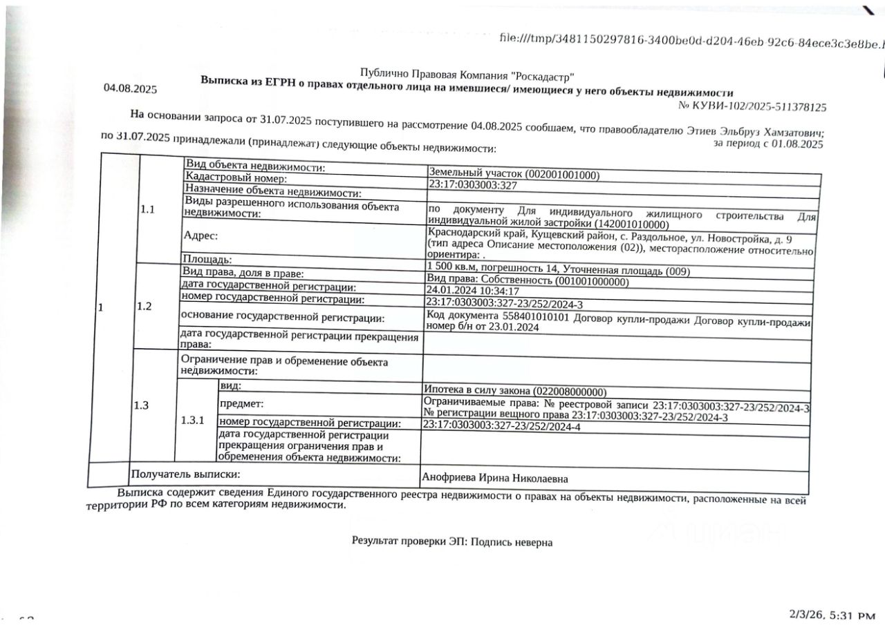 Д-к: Этиев Э.Х. Земельный участок (для индивидуального жилищного строительства), площадь 1500 кв.м., кадастровый номер 23:17:0303003:327. Адрес: Краснодарский край, Кущевский район, с. Раздольное, ул. Новостройка, д. 9. Начальная цена 93 600 руб., задаток 94 руб., шаг аукциона 936 руб., ув. 1949