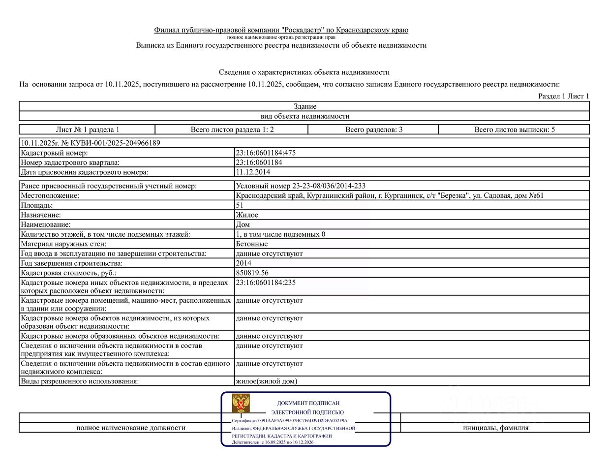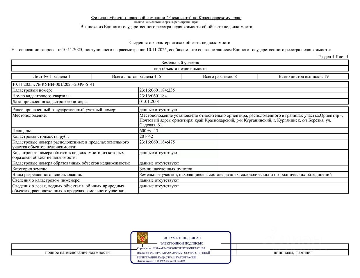 Д-к: Администрация Курганинского городского поселения. Жилой дом, площадь 51 кв.м., кадастровый номер 23:16:0601184:475 кв.м., земельный участок (земельные участки, находящиеся в составе дачных, садоводческих и огороднических объединений), площадь 600 +/-17 кв.м., кадастровый номер 23:16:0601184:235. Адрес: Краснодарский край, Курганинский район, г. Курганинск, с/т "Березка", ул.Садовая, д. 61. Начальная цена 1 173 000 руб., задаток 1 173 руб., шаг аукциона 11 730 руб., ув. 1744