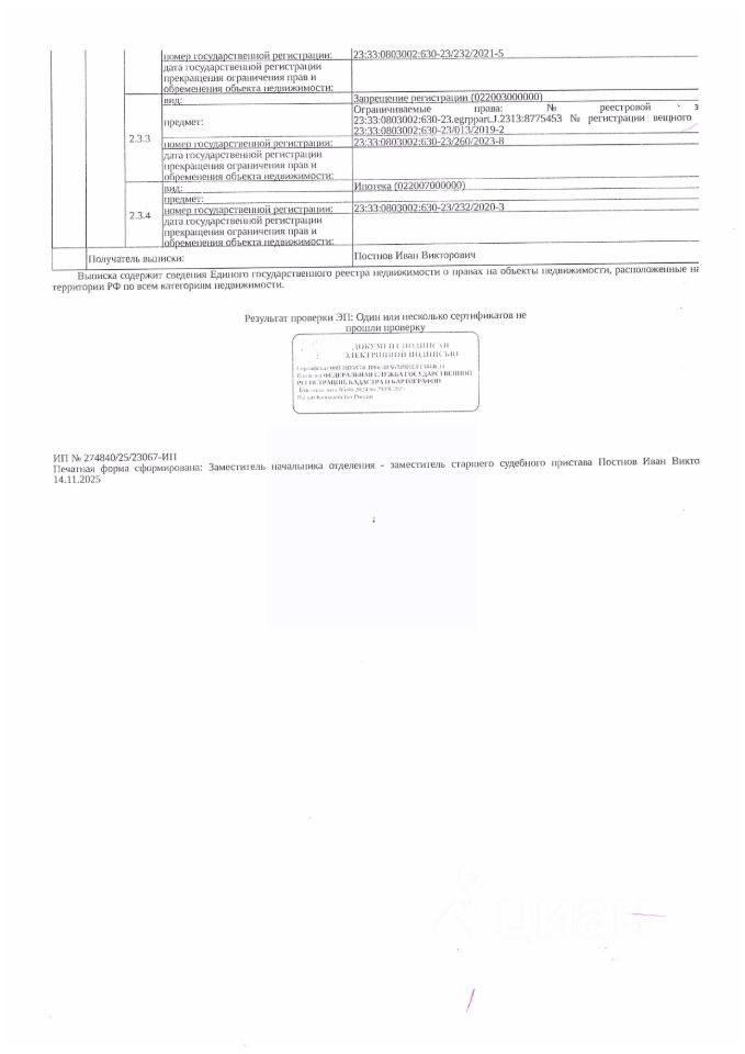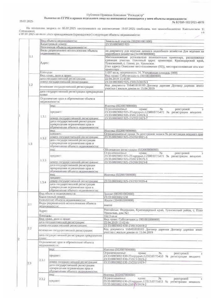 Д-к: Хмельницкая Т.С. Жилой дом, площадь 162,3 кв.м., кадастровый номер 23:33:0803002:630, земельный участок (для ведения личного подсобного хозяйства), площадь 1697+/-14 кв.м., кадастровый номер 23:33:0803002:925. Адрес: Краснодарский край, Туапсинский район, с. Пляхо, ул. Уральская, д. 1. Начальная цена 10 179 600 руб., задаток 10 180 руб., шаг аукциона 101 796 руб., ув. 1770