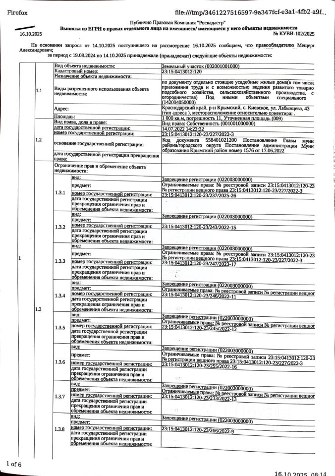Д-к: Мещеряков П.А. Земельный участок (отдельно стоящие усадебные жилые дома (в том числе с местами приложения труда и с возможностью ведения развитого товарного личного подсобного хозяйства, сельскохозяйственного производства, садоводства, огородничества)), площадь 1000 кв.м., кадастровый номер 23:15:0413012:120. Адрес: Краснодарский край, Крымский район, с. Киевское, ул. Лабынцева, 43. Начальная цена 294 457 руб., задаток 44 169 руб., шаг аукциона 2 945 руб., ув. 1562