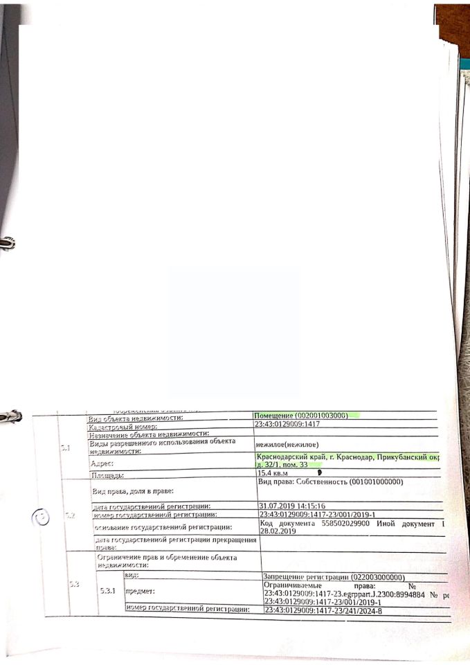 Д-к: Ходьбин А.Н. Нежилое помещение, площадь 15,4 кв.м., кадастровый номер 23:43:0129009:1417. Адрес: Краснодарский край, г. Краснодар, ул. Шаляпина, д. 32/1, пом. 33. Начальная цена 668 291,25 руб., задаток 100 244 руб., шаг аукциона 6 683 руб., ув. 1695