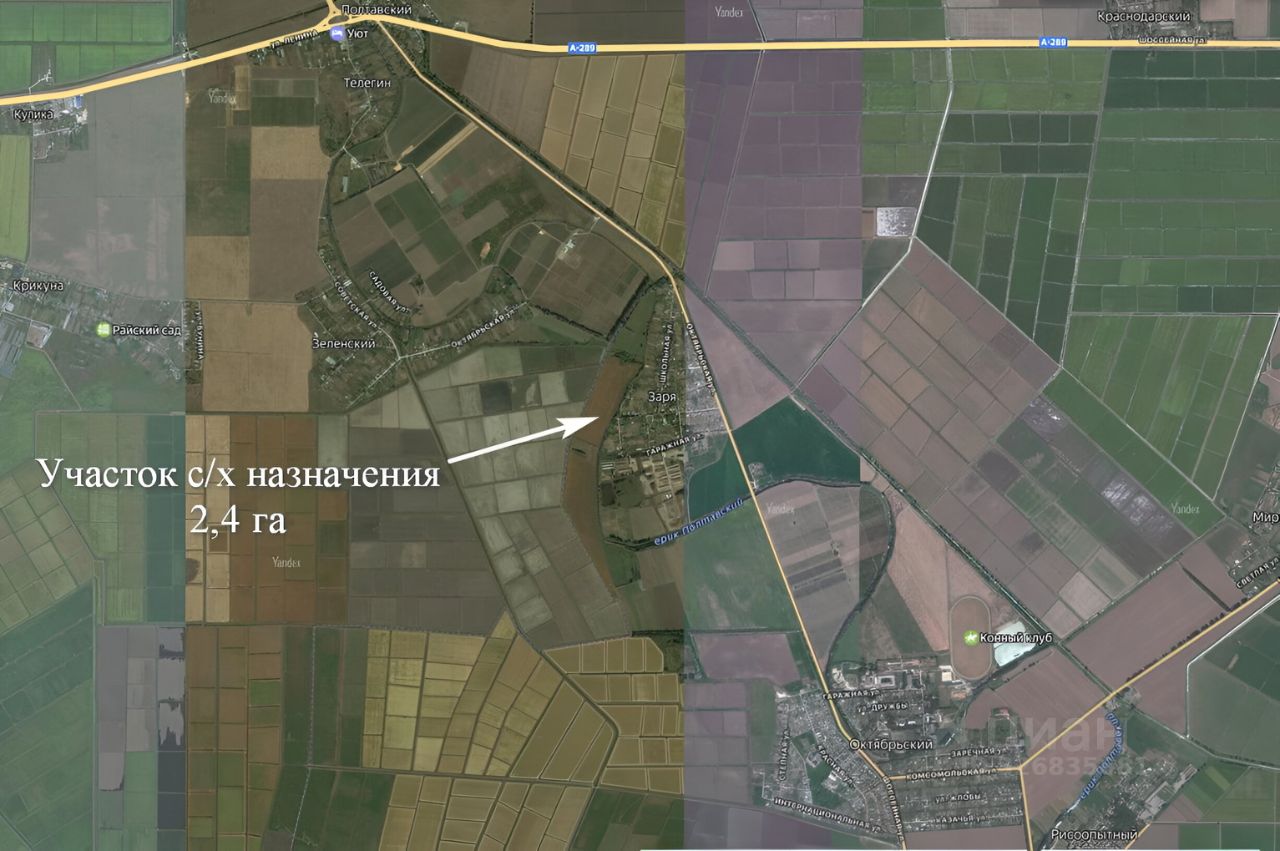 Продаётся участок сельскохозяйственного назначения для сельскохозяйственного производства площадью 2,4 га в Красноармейском районе, посёлок Заря, выходящий на ерик Полтавский.