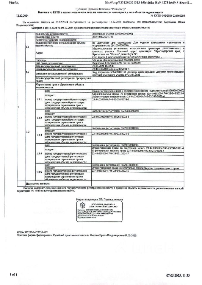 Д-к: Коробкина Ю.В. Земельный участок (для ведения садоводства и огородничества), площадь 572 кв.м., кадастровый номер 23:44:0302004:746. Адрес: Краснодарский край, г. Кропоткин, с/т "Лесное", линия 6, участок 24. Границы земельного участка не установлены в соответствии с требованиями земельного законодательства. Начальная цена 835 234 руб., задаток 125 286 руб., шаг аукциона 8 353 руб., ув. 110