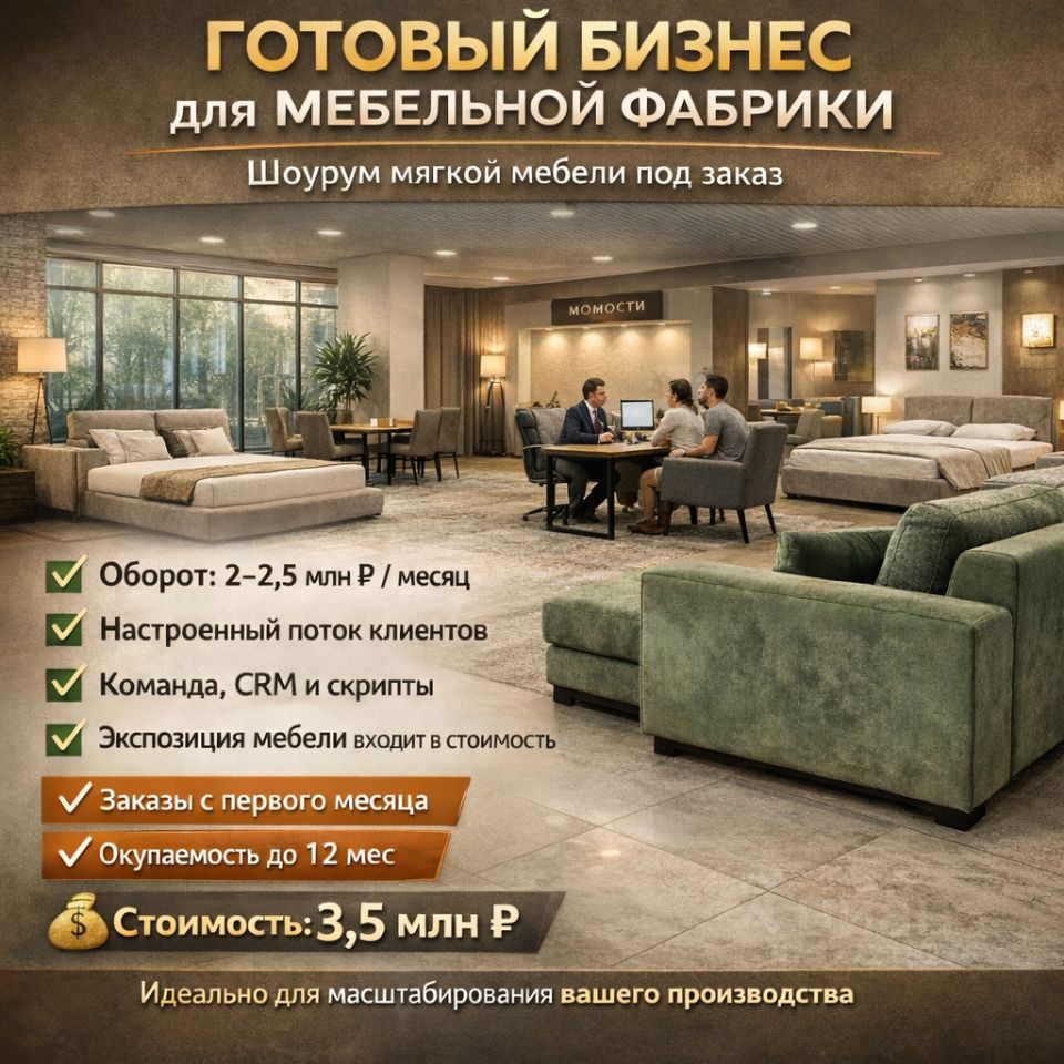 Продаётся действующий шоурум мягкой мебели под заказ — готовая точка продаж с настроенным потоком клиентов и сформированной репутацией на рынке.