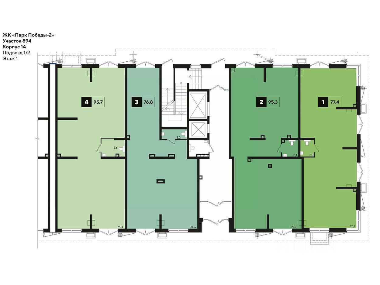 В реализации — коммерческие помещения свободного назначения в литере 14 общей площадью 96.60 кв.м. на 1 этаже в микрорайоне "Парк Победы" от застройщика DOGMA, одного из ведущих девелоперов Краснодарского края.