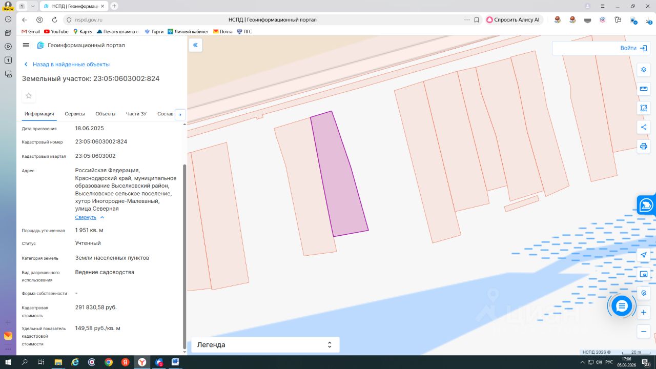 земельный участок с кадастровым номером 23:05:0603002:824, находящийся в государственной собственности, категория земель - земли населенных пунктов, площадью 1951 кв. м, расположенный по адресу: Российская Федерация, Краснодарский край, муниципальное образование Выселковский район, Выселковское сельское поселение, хутор Иногородне- Малеваный, улица Северная , вид разрешенного использования: ведение садоводства.