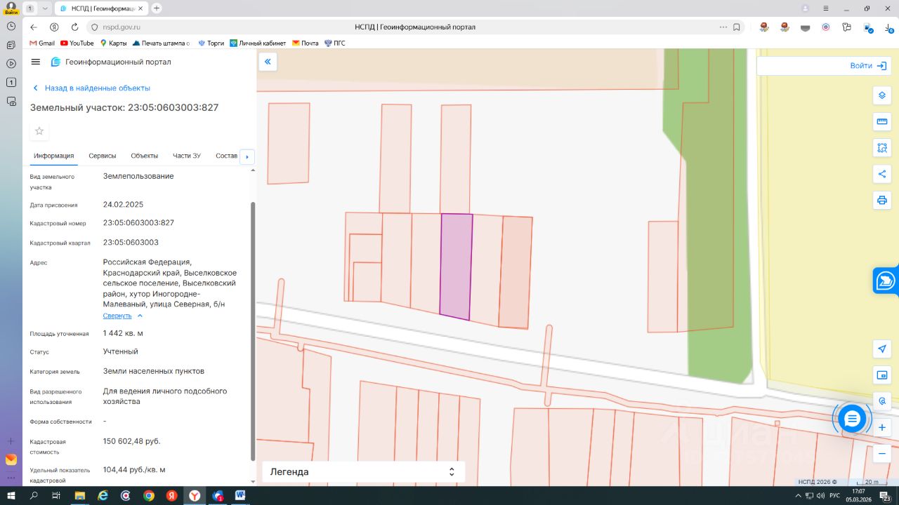 земельный участок с кадастровым номером 23:05:0603003:827, находящийся в государственной собственности, категория земель - земли населенных пунктов, площадью 1442 кв. м, расположенный по адресу: Российская Федерация, Краснодарский край, Выселковский район, Выселковское сельское поселение, хутор Иногородне- Малеваный, улица Северная , вид разрешенного использования: для ведения личного подсобного хозяйства
