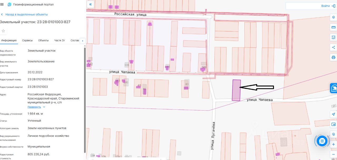 Земельный участок с кадастровым номером 23:28:0101003:827 площадь 1664 по адресу Российская Федерация, Краснодарский край, Староминский муниципальный р-н, с/п Староминское, ст-ца Староминская, ул. Чапаева, з/у 71