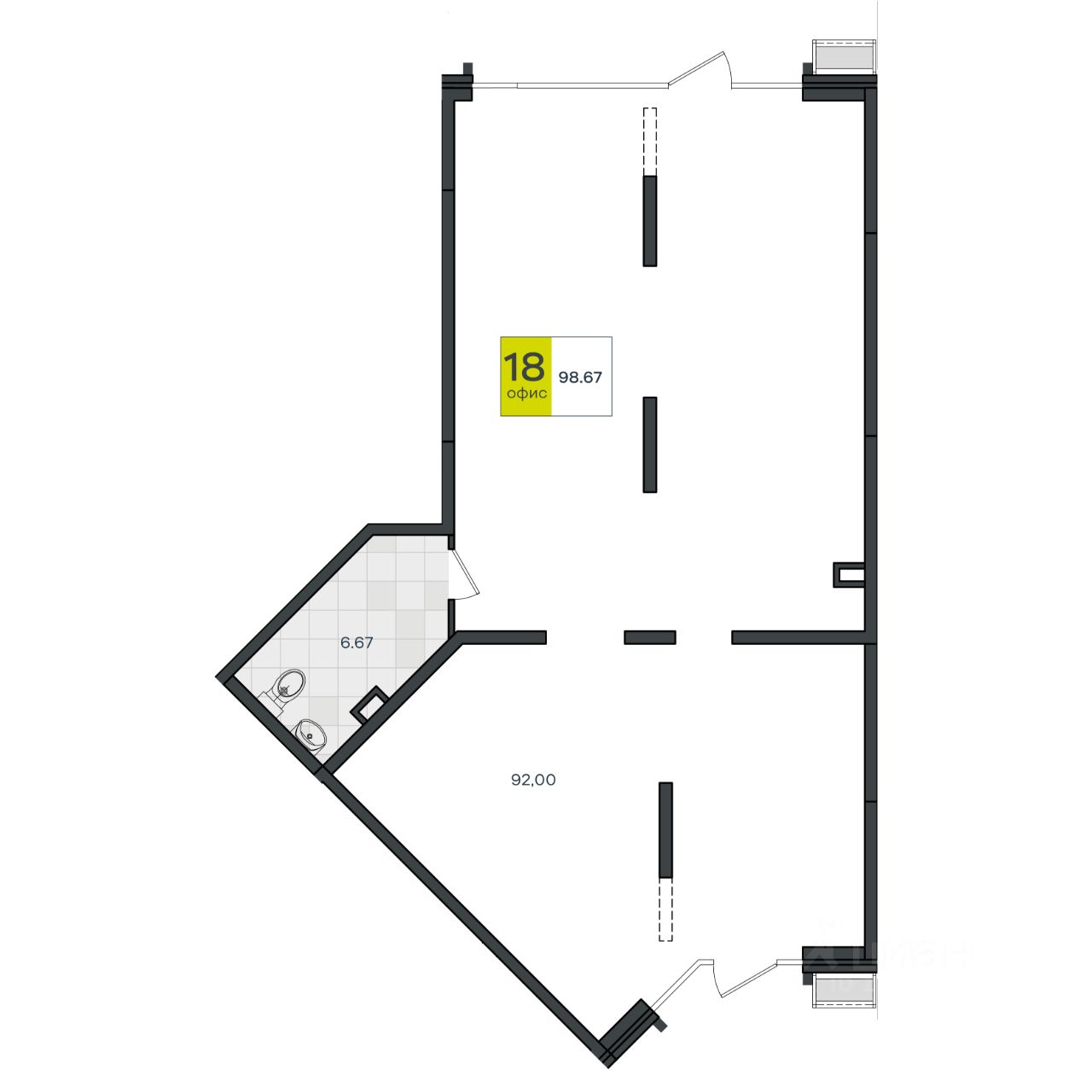 Коммерческое помещение площадью 98.67 находится на 1-м этаже нового жилого снеднеэтажного дома. Помещение в предчистовой отделке, есть возможность сделать ремонт под свой бизнес-продукт или услугу, планировка свободная. Все коммуникации центральные, высота потолков 3, 64 м.