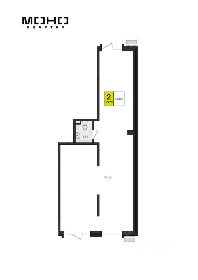 Коммерческое помещение площадью 77.11 находится на 1-м этаже нового жилого снеднеэтажного дома. Помещение в предчистовой отделке, есть возможность сделать ремонт под свой бизнес-продукт или услугу, планировка свободная. Все коммуникации центральные, высота потолков 3, 64 м.