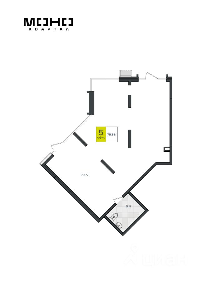 Коммерческое помещение площадью 76.29 находится на 1-м этаже нового жилого снеднеэтажного дома. Помещение в предчистовой отделке, есть возможность сделать ремонт под свой бизнес-продукт или услугу, планировка свободная. Все коммуникации центральные, высота потолков 3, 64 м.