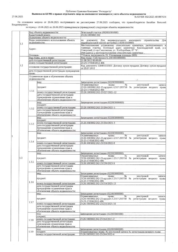 Д-к: Балабан В.В. Земельный участок (для индивидуальной жилой застройки), площадь 774 кв.м., кадастровый номер 23:26:1003002:262. Адрес: Краснодарский край, Северский район, ст. Смоленская, ул. Хлеборобная, 67 Б. Начальная цена 916 969,80 руб., задаток 137 546 руб., шаг аукциона 9 170 руб., ув. 1850