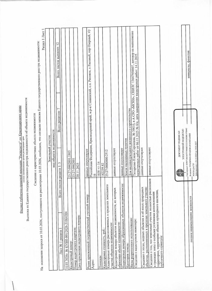 Земельный участок, расположенный по адресу: Российская Федерация, Краснодарский край, Славянский муниципальный район, Рисовое сельское поселение, п. Рисовый, пер. Озерный, земельный участок 16