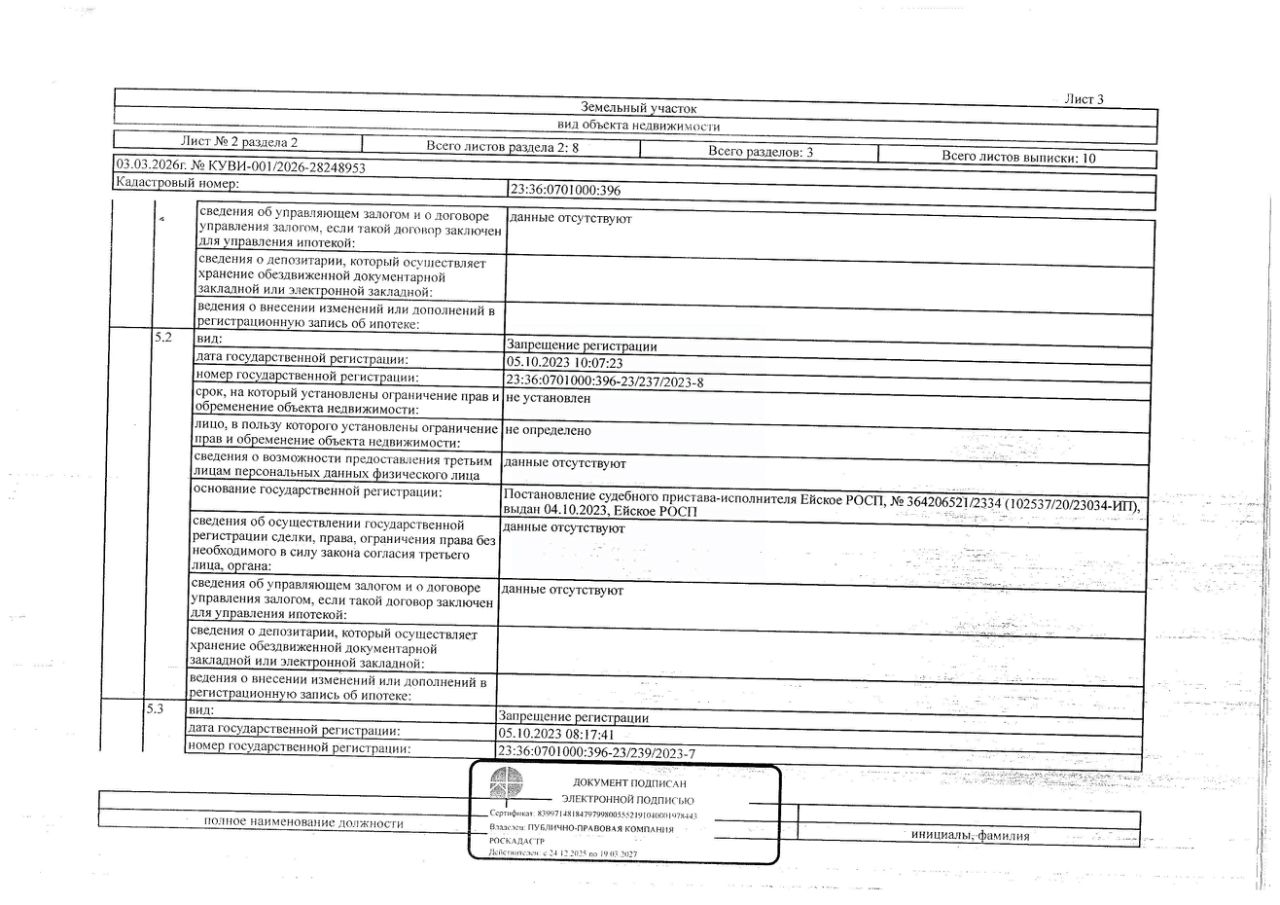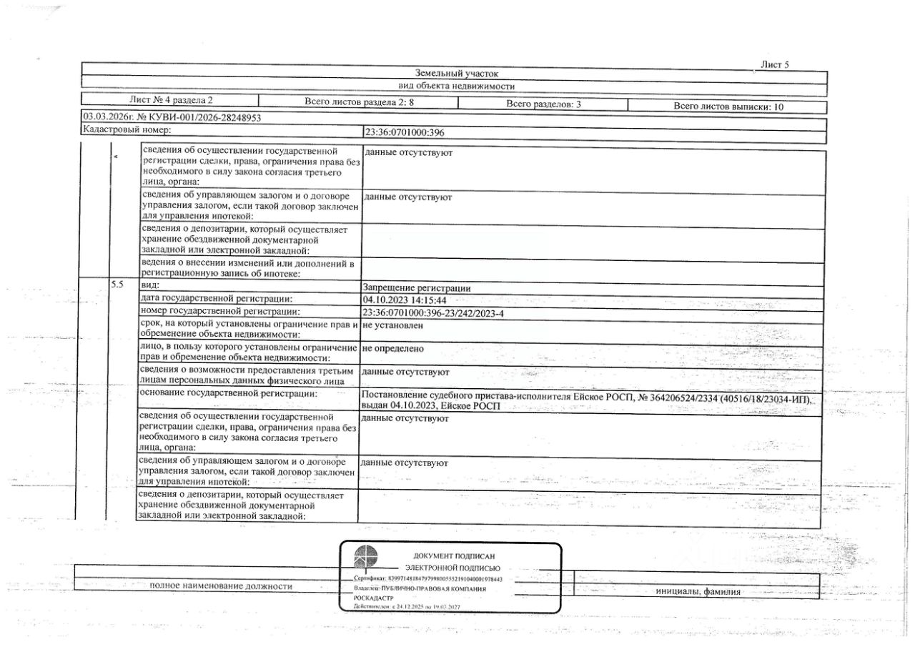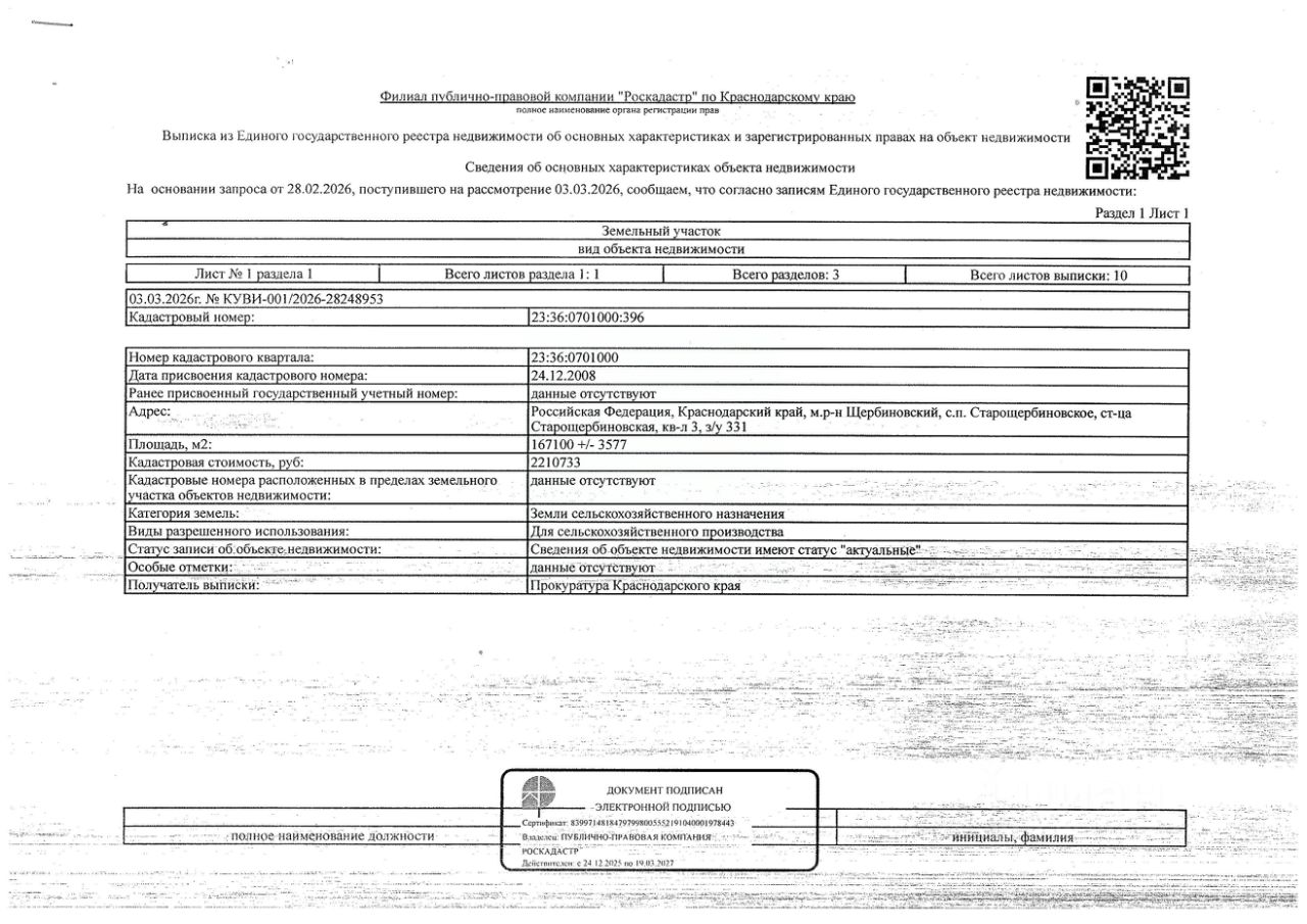 Д-к: Белоглазова В.П. 1/2 доля земельного участка (для сельскохозяйственного производства), площадь 167100+/-3577 кв.м., кадастровый номер 23:36:0701000:396. Адрес: Краснодарский край, Щербиновский район, ст. Старощербиновская, кв-л 3, уч. 331. Начальная цена 266 378 руб., задаток 39 957 руб., шаг аукциона 2 664 руб., ув. 213,