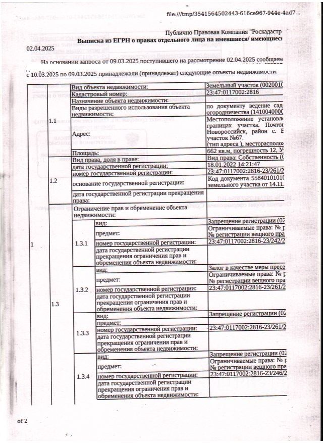 Д-к: Осипова И.С. Земельный участок (для ведения садоводства и огородничества), площадь 662 кв.м., кадастровый номер 23:47:0117002:2816. Адрес: Краснодарский край, г. Новороссийск, с. Владимировка, Чемизовская щель, СНТ "Садко", участок 67. Начальная цена 556 448,40 руб., задаток 557 руб., шаг аукциона 5 565 руб., ув. 81