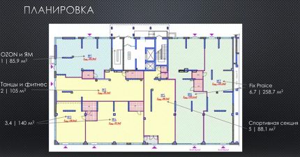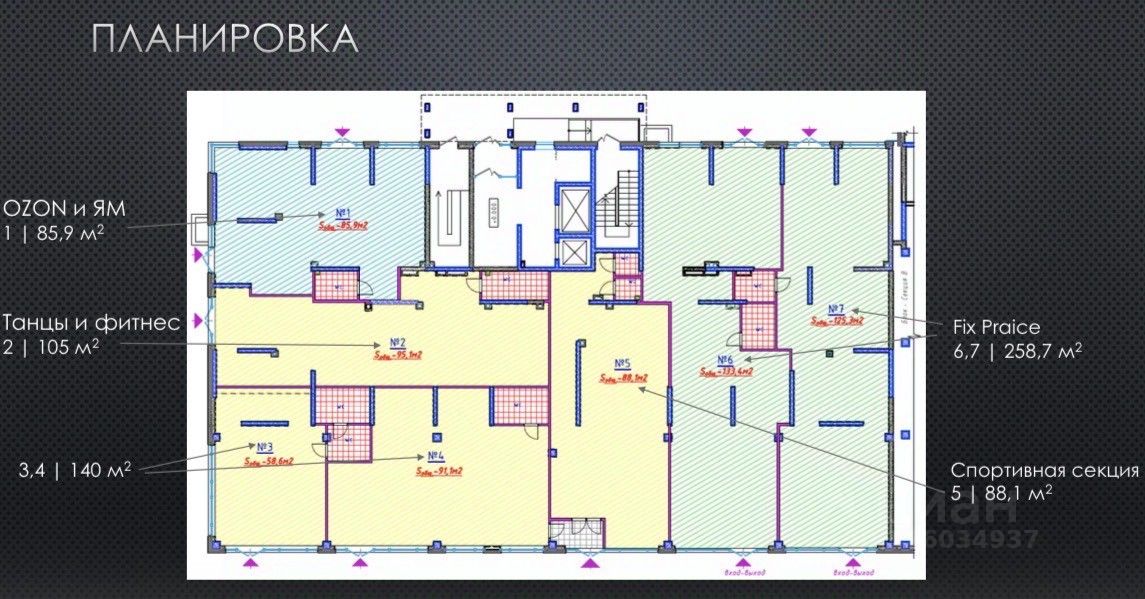 6) ПОМ 6, 7: 258,7м2 - имеет 4 отдельных входа с фасада и двора (Согласован арендатор Фикс Прайс, с ремонтом).