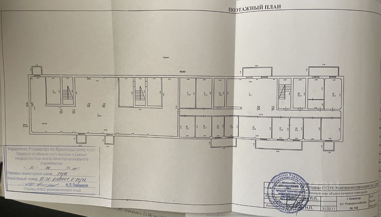 Нежилые помещения 1,2,5-7,10,14-22 (подвал) с кадастровым номером 23:38:0103001:205, общей площадью 503,5 квадратных метра, расположенные по адресу: город Армавир, улица Новороссийская, 108
