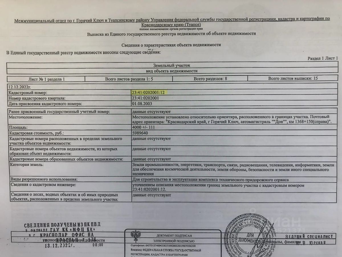 Продается участок площадь 0,4 га, возле трассы, собственность. Для строительства и эксплуатации комплекса технического придорожного сервиса (автодорога М-4 ДОН (справа), по направлению в сторону моря. Электричество по границе.