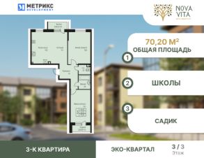 Продаётся 3-комнатная квартира в строящемся доме (Литер 19), срок сдачи: IV-кв. 2025, общей площадью 70.2 кв.м., на 3 этаже. Новый жилой комплекс "Nova Vita" от застройщика МЕТРИКС DEVELOPMENT расположен по адресу Краснодар, посёлок Берёзовый, улица имени А.Н. Лодыгина.