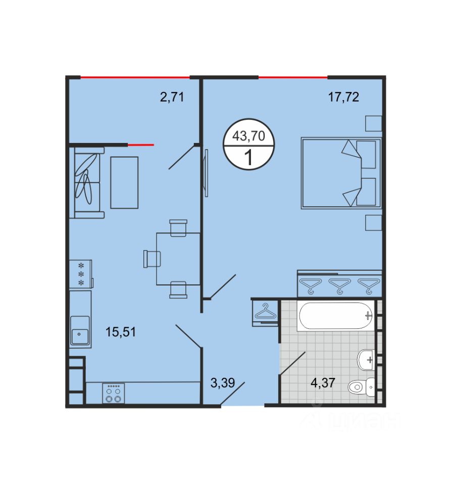 Общая площадь43,7 м²