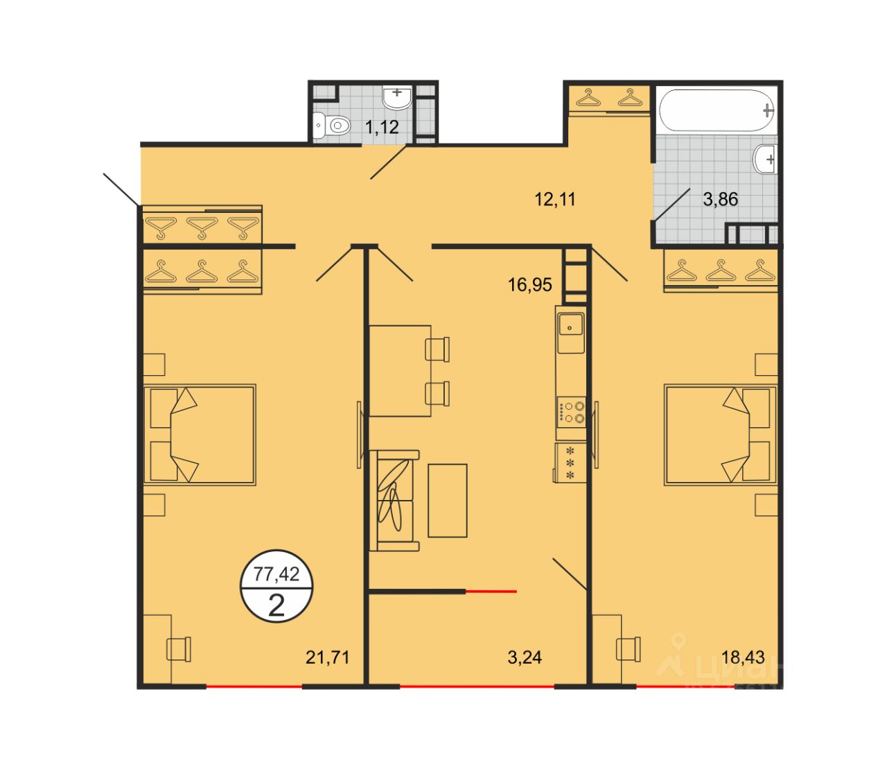 Общая площадь77,42 м²