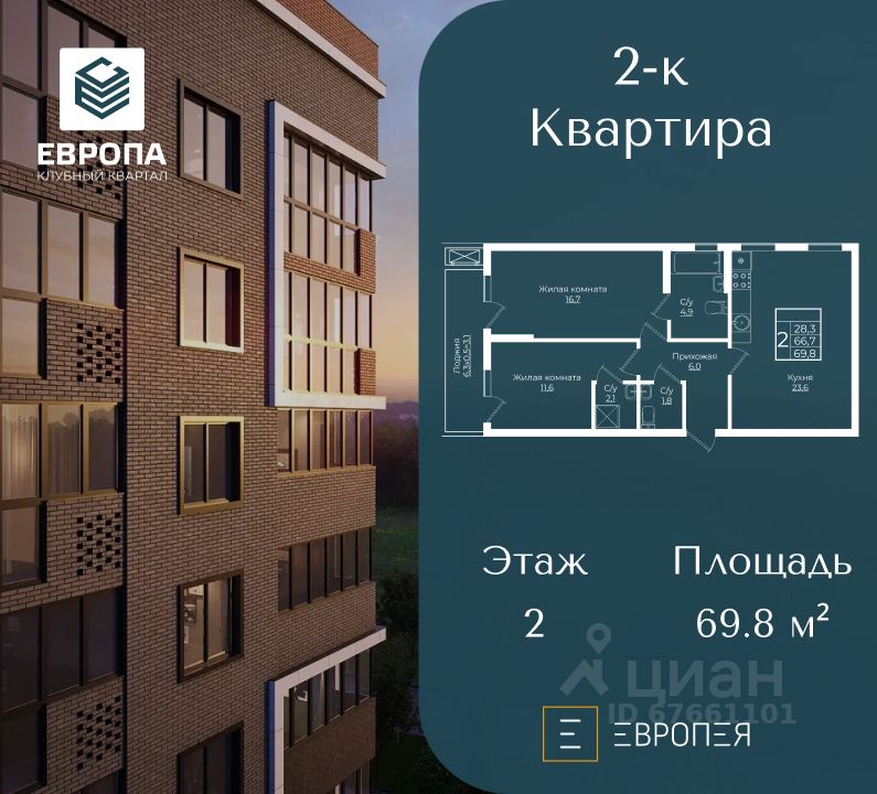 Клубный квартал Европа — уютный жилой район, гармонично сочетающий в себе яркие дизайнерские решения, прекрасную экологию и благоустроенные общественные пространства. Расположен в уникальной локации рядом с культовой "Немецкой Деревней". Всего за несколько минут вы сможете прогуляться до живописного Лебединого озера, площади с фонтаном и других знаковых мест этого уютного и развитого района. На территории квартала созданы все условия для комфортной жизни: развитая транспортная инфраструктура — как для владельцев автомобилей, так и для тех, кто предпочитает общественный транспорт. Внутри комплекса вас ждут современные детские и спортивные площадки, зоны отдыха и безопасные прогулочные маршруты. В районе установлена система видеонаблюдения, что гарантирует высокий уровень безопасности. Квартиры с смарт-планировками предоставляют полную свободу для воплощения ваших идей. Создайте пространство, отражающее ваш стиль и потребности, наслаждайтесь комфортом и индивидуальностью в каждом уголке вашей новой квартиры. Звоните прямо сейчас и станьте частью этого современного, безопасного и комфортабельного жилого квартала "Европа". Ваша новая квартира ждет именно вас! Стоимость является предварительной и может меняться в зависимости от выбранной ипотечной программы и дополнительных опций. Для уточнения стоимости необходимо обратиться в отдел продаж ГК "Европея".