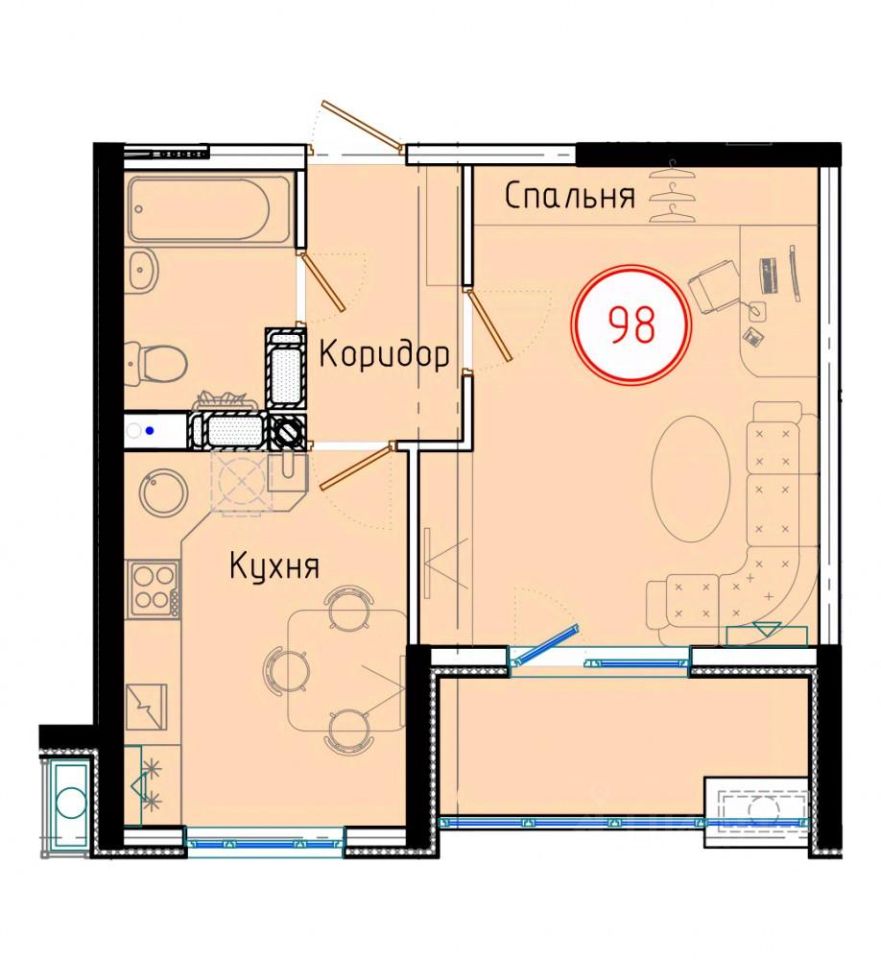 Продаётся 1-комнатная квартира в сданном доме (Литер 3), срок сдачи: IV-кв. 2023, общей площадью 42.3 кв.м., на 6 этаже.