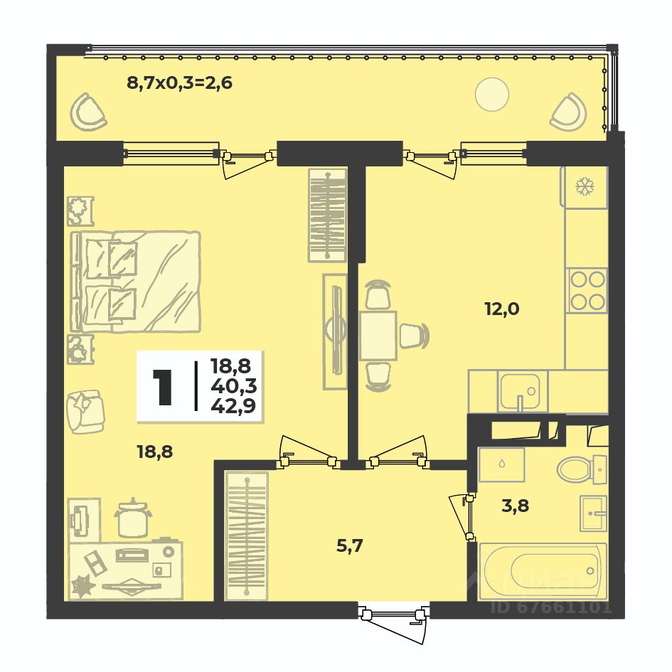 Общая площадь42,9 м²