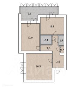 Общая площадь - 50,9 кв.м, комнаты изолированные 16,5 и 12 кв.м, кухня 8,9 кв.м, с выходом на балкон, переходящий в большую лоджию.