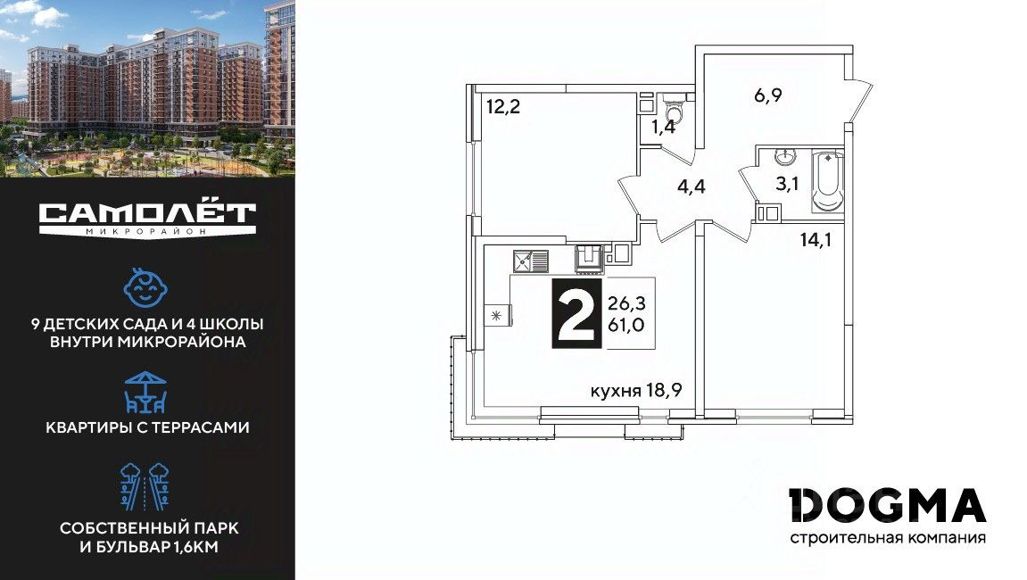 DOGMA - ТОП-3 застройщик по объему строительства в РФ. "САМОЛЁТ" — концептуальный жилой микрорайон, который расположен на северо-западе Краснодара, в районе Западного Обхода. Квартал спроектирован как "город в городе", поэтому здесь будет всё для комфортной жизни: современные дома с разными планировками, дороги, школы и детские сады, поликлиника, торговые центры, парки и аллеи. Микрорайон находится далеко от промышленных предприятий, сочетает удобство городской жизни и экологически благоприятную среду. Инфраструктура нового микрорайона: • 4 школы и 9 детских садов на территории микрорайона • Функциональные планировки • Собственный бульвар протяжённостью 1,6км • Светомузыкальный фонтан протяжённостью 55 метров • Амфитеатр • Парк 7 ГА • Скейт-парк • Детская аква-площадка • Круглосуточное видеонаблюдение и пост охраны Приобрести квартиру можно одним из способов: ипотека, рассрочка, наличный расчет.