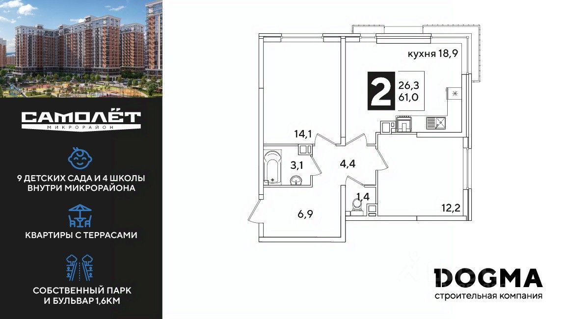 DOGMA - ТОП-3 застройщик по объему строительства в РФ. "САМОЛЁТ" — концептуальный жилой микрорайон, который расположен на северо-западе Краснодара, в районе Западного Обхода. Квартал спроектирован как "город в городе", поэтому здесь будет всё для комфортной жизни: современные дома с разными планировками, дороги, школы и детские сады, поликлиника, торговые центры, парки и аллеи. Микрорайон находится далеко от промышленных предприятий, сочетает удобство городской жизни и экологически благоприятную среду. Инфраструктура нового микрорайона: • 4 школы и 9 детских садов на территории микрорайона • Функциональные планировки • Собственный бульвар протяжённостью 1,6км • Светомузыкальный фонтан протяжённостью 55 метров • Амфитеатр • Парк 7 ГА • Скейт-парк • Детская аква-площадка • Круглосуточное видеонаблюдение и пост охраны Приобрести квартиру можно одним из способов: ипотека, рассрочка, наличный расчет.