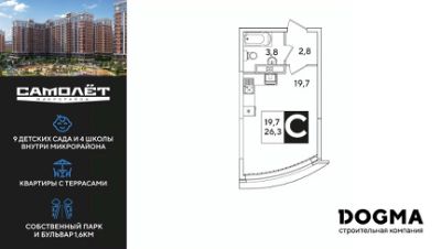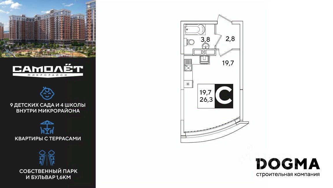 DOGMA - ТОП-3 застройщик по объему строительства в РФ. "САМОЛЁТ" — концептуальный жилой микрорайон, который расположен на северо-западе Краснодара, в районе Западного Обхода. Квартал спроектирован как "город в городе", поэтому здесь будет всё для комфортной жизни: современные дома с разными планировками, дороги, школы и детские сады, поликлиника, торговые центры, парки и аллеи. Микрорайон находится далеко от промышленных предприятий, сочетает удобство городской жизни и экологически благоприятную среду. Инфраструктура нового микрорайона: • 4 школы и 9 детских садов на территории микрорайона • Функциональные планировки • Собственный бульвар протяжённостью 1,6км • Светомузыкальный фонтан протяжённостью 55 метров • Амфитеатр • Парк 7 ГА • Скейт-парк • Детская аква-площадка • Круглосуточное видеонаблюдение и пост охраны Приобрести квартиру можно одним из способов: ипотека, рассрочка, наличный расчет.