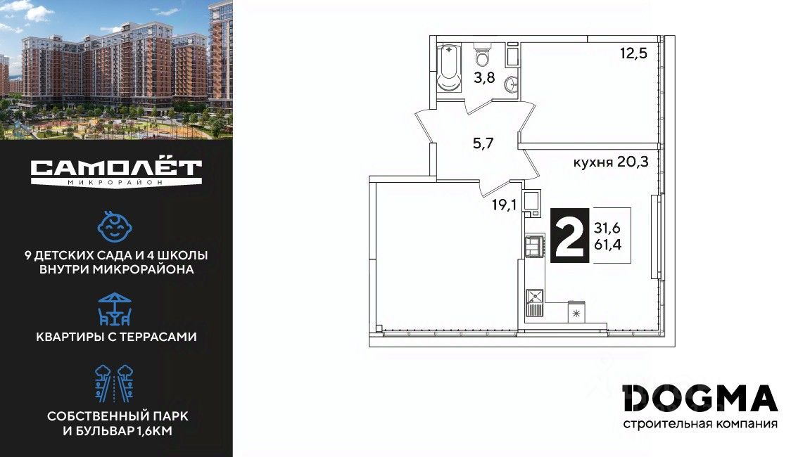 DOGMA - ТОП-3 застройщик по объему строительства в РФ. "САМОЛЁТ" — концептуальный жилой микрорайон, который расположен на северо-западе Краснодара, в районе Западного Обхода. Квартал спроектирован как "город в городе", поэтому здесь будет всё для комфортной жизни: современные дома с разными планировками, дороги, школы и детские сады, поликлиника, торговые центры, парки и аллеи. Микрорайон находится далеко от промышленных предприятий, сочетает удобство городской жизни и экологически благоприятную среду. Инфраструктура нового микрорайона: • 4 школы и 9 детских садов на территории микрорайона • Функциональные планировки • Собственный бульвар протяжённостью 1,6км • Светомузыкальный фонтан протяжённостью 55 метров • Амфитеатр • Парк 7 ГА • Скейт-парк • Детская аква-площадка • Круглосуточное видеонаблюдение и пост охраны Приобрести квартиру можно одним из способов: ипотека, рассрочка, наличный расчет.