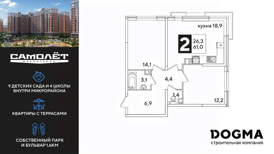 DOGMA - ТОП-3 застройщик по объему строительства в РФ. "САМОЛЁТ" — концептуальный жилой микрорайон, который расположен на северо-западе Краснодара, в районе Западного Обхода. Квартал спроектирован как "город в городе", поэтому здесь будет всё для комфортной жизни: современные дома с разными планировками, дороги, школы и детские сады, поликлиника, торговые центры, парки и аллеи. Микрорайон находится далеко от промышленных предприятий, сочетает удобство городской жизни и экологически благоприятную среду. Инфраструктура нового микрорайона: • 4 школы и 9 детских садов на территории микрорайона • Функциональные планировки • Собственный бульвар протяжённостью 1,6км • Светомузыкальный фонтан протяжённостью 55 метров • Амфитеатр • Парк 7 ГА • Скейт-парк • Детская аква-площадка • Круглосуточное видеонаблюдение и пост охраны Приобрести квартиру можно одним из способов: ипотека, рассрочка, наличный расчет.