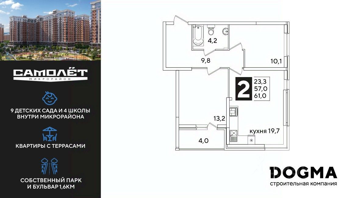 DOGMA - ТОП-3 застройщик по объему строительства в РФ. "САМОЛЁТ" — концептуальный жилой микрорайон, который расположен на северо-западе Краснодара, в районе Западного Обхода. Квартал спроектирован как "город в городе", поэтому здесь будет всё для комфортной жизни: современные дома с разными планировками, дороги, школы и детские сады, поликлиника, торговые центры, парки и аллеи. Микрорайон находится далеко от промышленных предприятий, сочетает удобство городской жизни и экологически благоприятную среду. Инфраструктура нового микрорайона: • 4 школы и 9 детских садов на территории микрорайона • Функциональные планировки • Собственный бульвар протяжённостью 1,6км • Светомузыкальный фонтан протяжённостью 55 метров • Амфитеатр • Парк 7 ГА • Скейт-парк • Детская аква-площадка • Круглосуточное видеонаблюдение и пост охраны Приобрести квартиру можно одним из способов: ипотека, рассрочка, наличный расчет.