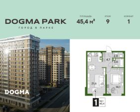 В продаже 1-комнатная квартира от застройщика! Мкр. "DOGMA PARK" г. Краснодар, Литер 24 Срок сдачи: 4 кв. 2027, общей площадью 45.4 кв.м., на 9 этаже.