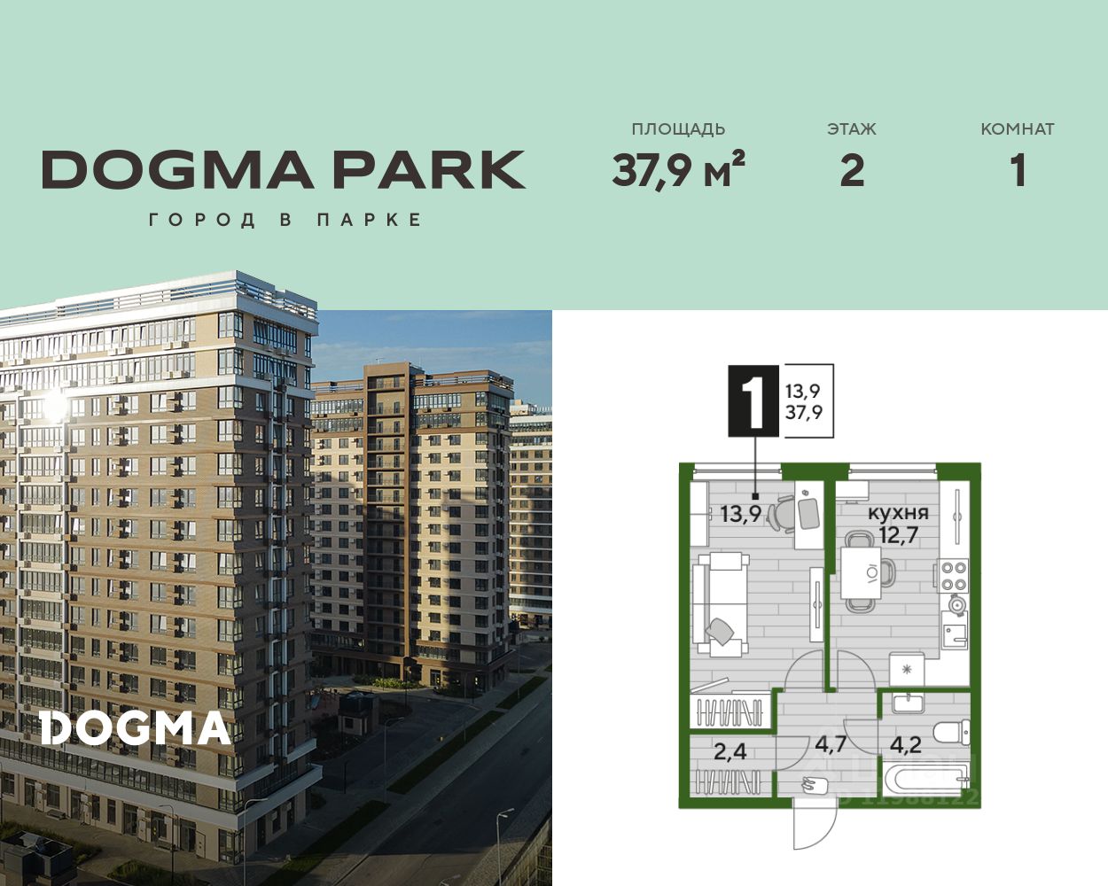 В продаже 1-комнатная квартира от застройщика! Мкр. "DOGMA PARK" г. Краснодар, Литер 12 Срок сдачи: 4 кв. 2026, общей площадью 37.9 кв.м., на 2 этаже.