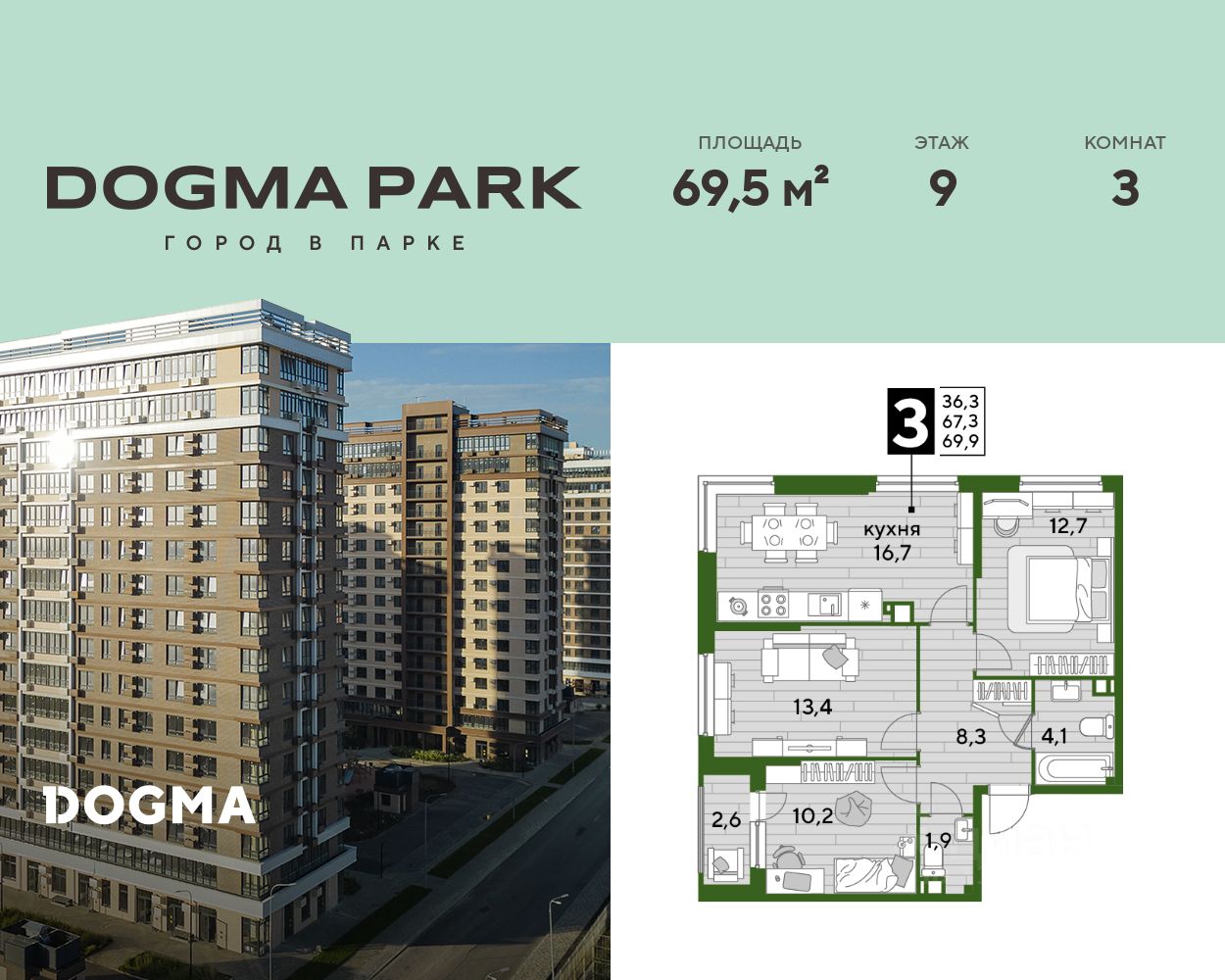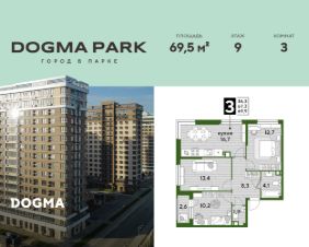 В продаже 3-комнатная квартира от застройщика! Мкр. "DOGMA PARK" г. Краснодар, Литер 9 Срок сдачи: 4 кв. 2026, общей площадью 69.5 кв.м., на 9 этаже.