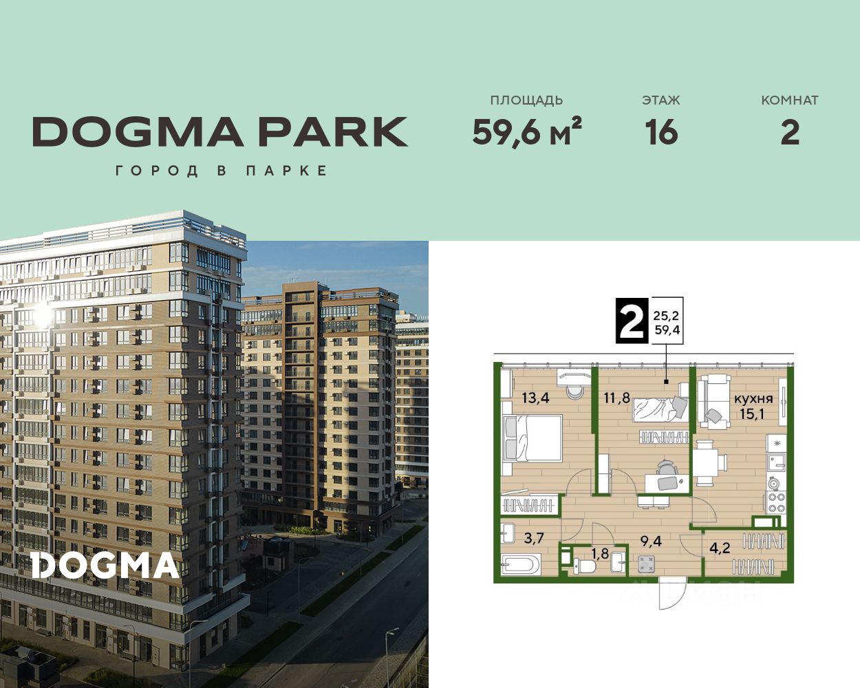 В продаже 2-комнатная квартира от застройщика! Мкр. "DOGMA PARK" г. Краснодар, Литер 9 Срок сдачи: 4 кв. 2026, общей площадью 59.6 кв.м., на 16 этаже.