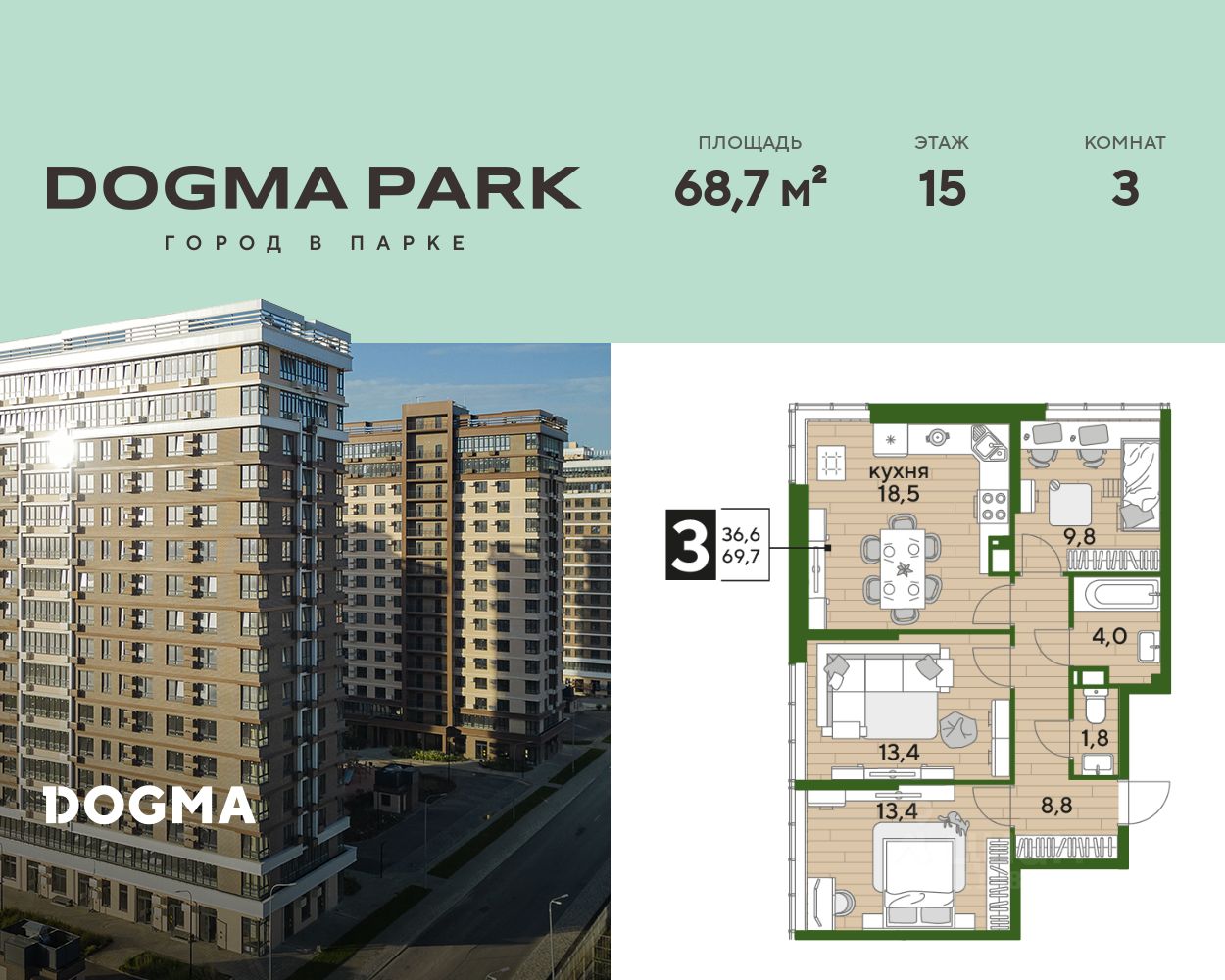 В продаже 3-комнатная квартира от застройщика! Мкр. "DOGMA PARK" г. Краснодар, Литер 7 Срок сдачи: 4 кв. 2026, общей площадью 68.7 кв.м., на 15 этаже.