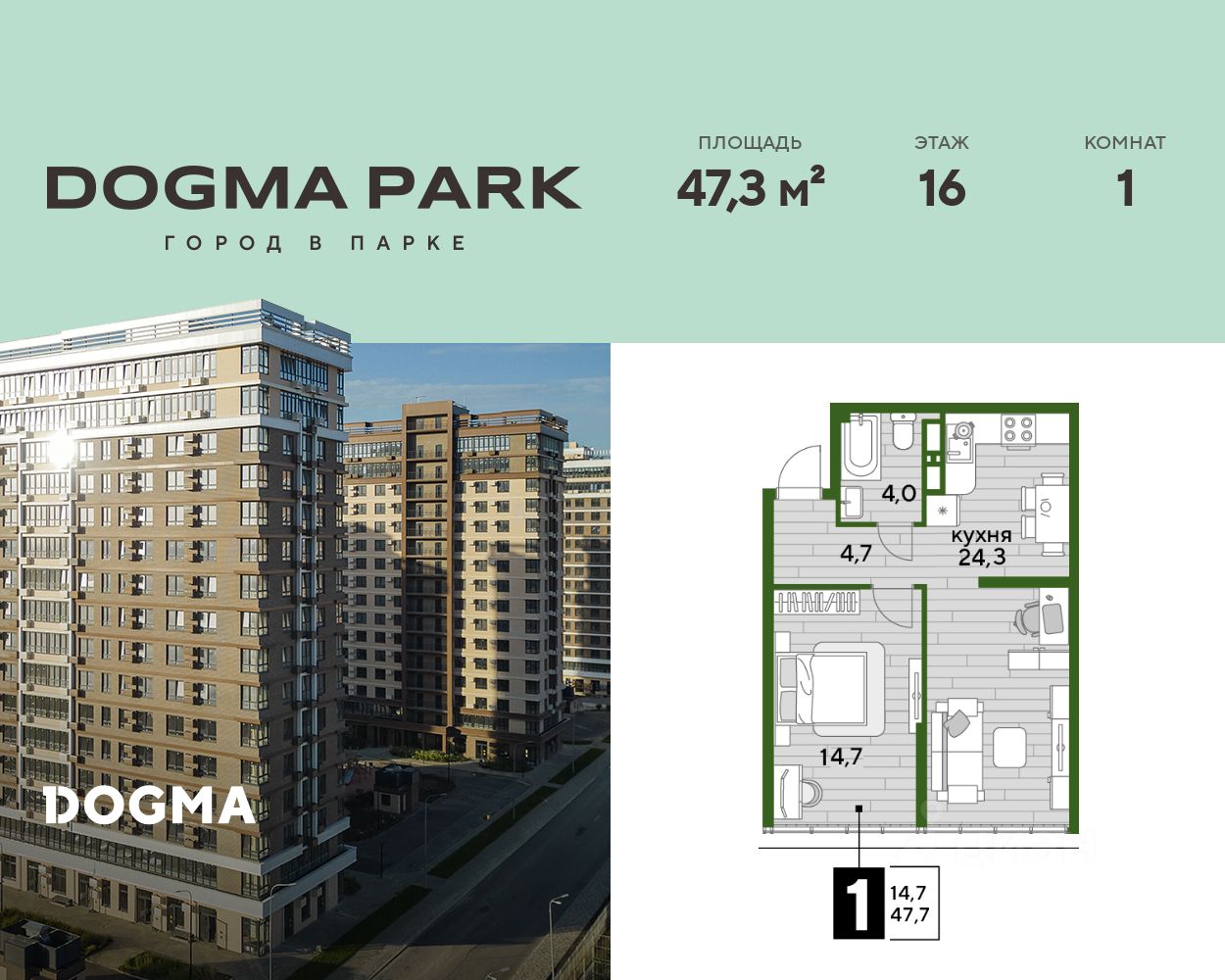 В продаже 1-комнатная квартира от застройщика! Мкр. "DOGMA PARK" г. Краснодар, Литер 1 Срок сдачи: 4 кв. 2026, общей площадью 47.3 кв.м., на 16 этаже.