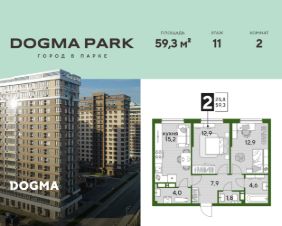 В продаже 2-комнатная квартира от застройщика! Мкр. "DOGMA PARK" г. Краснодар, Литер 18 Срок сдачи: 4 кв. 2027, общей площадью 59.3 кв.м., на 11 этаже.