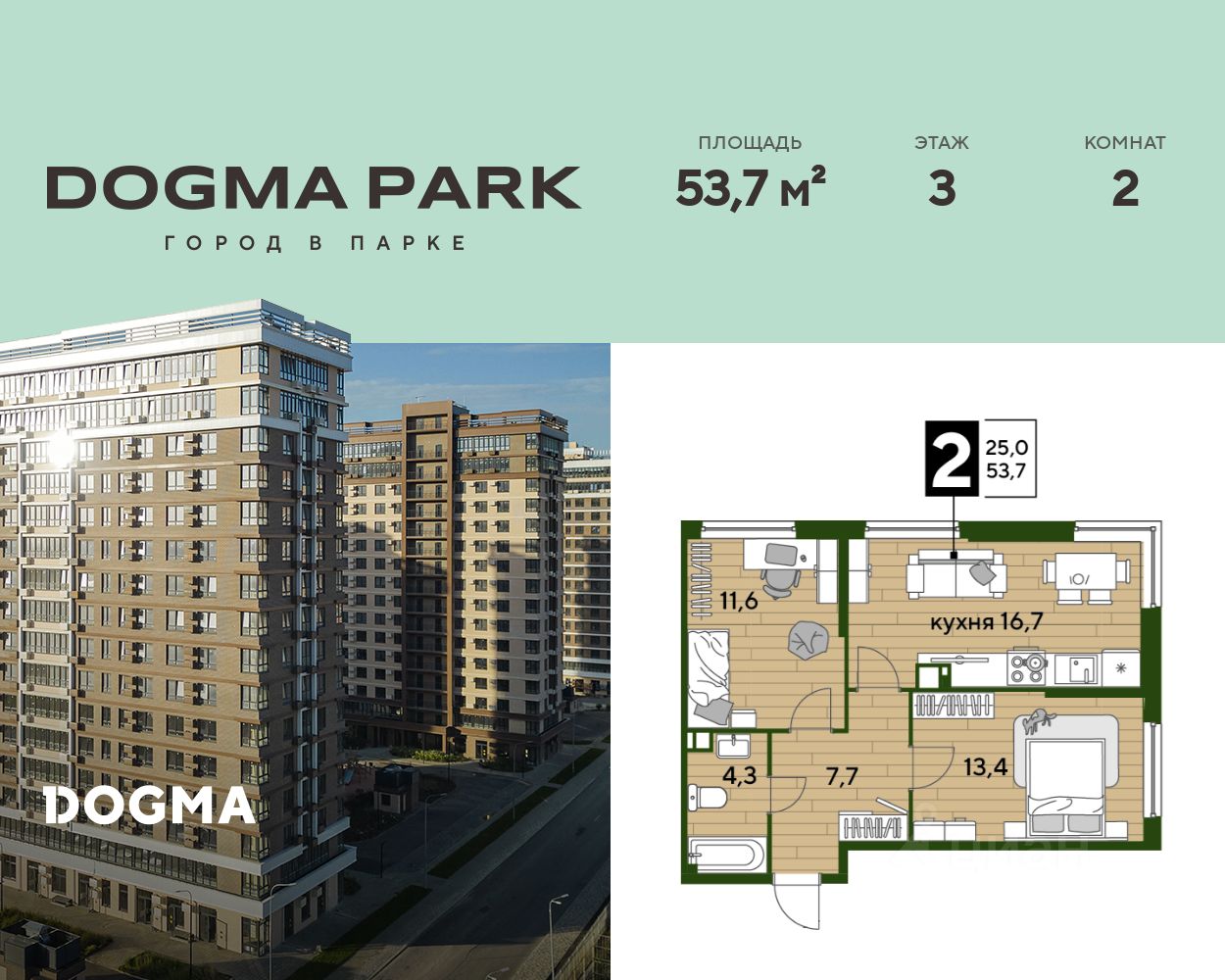 В продаже 2-комнатная квартира от застройщика! Мкр. "DOGMA PARK" г. Краснодар, Литер 22 Срок сдачи: 4 кв. 2027, общей площадью 53.7 кв.м., на 3 этаже.