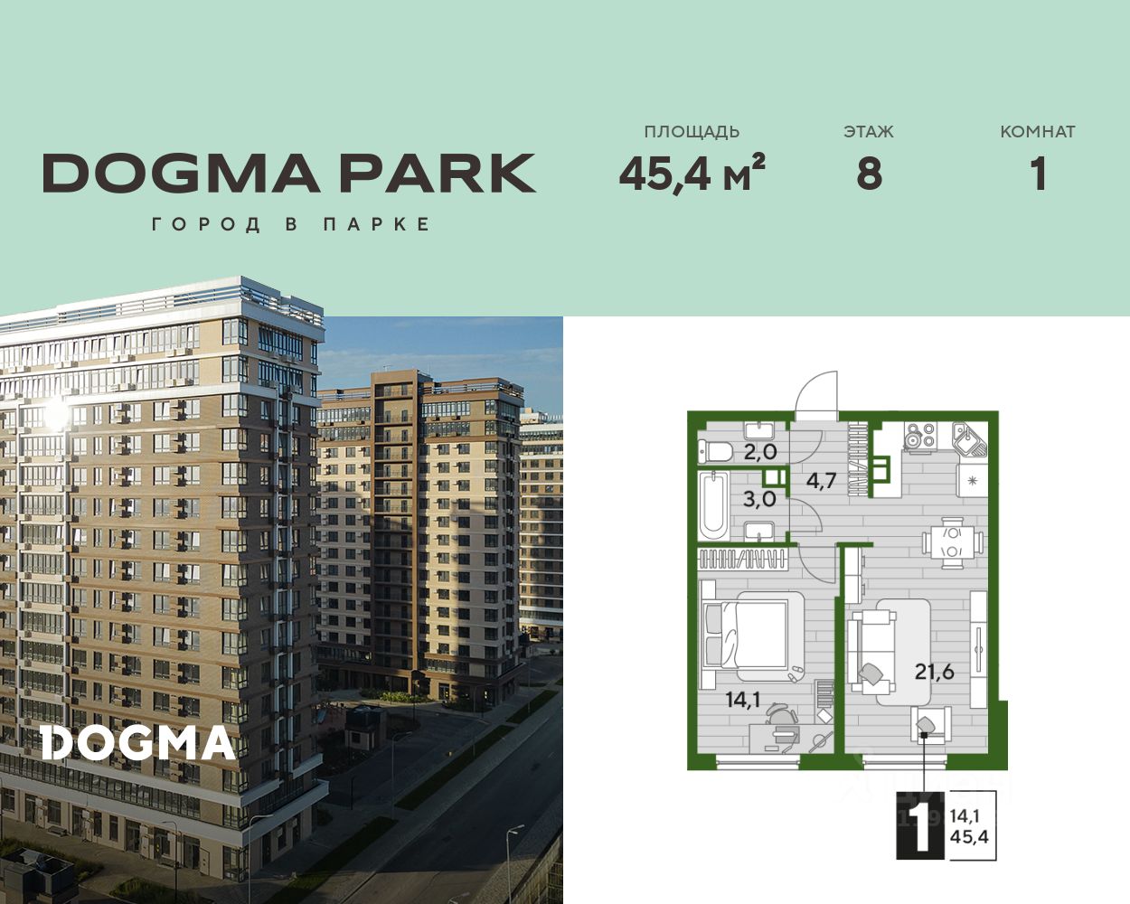 В продаже 1-комнатная квартира от застройщика! Мкр. "DOGMA PARK" г. Краснодар, Литер 22 Срок сдачи: 4 кв. 2027, общей площадью 45.4 кв.м., на 8 этаже.