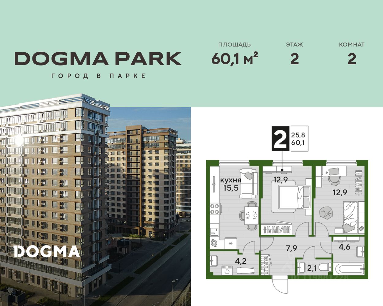 В продаже 2-комнатная квартира от застройщика! Мкр. "DOGMA PARK" г. Краснодар, Литер 23 Срок сдачи: 4 кв. 2027, общей площадью 60.1 кв.м., на 2 этаже.