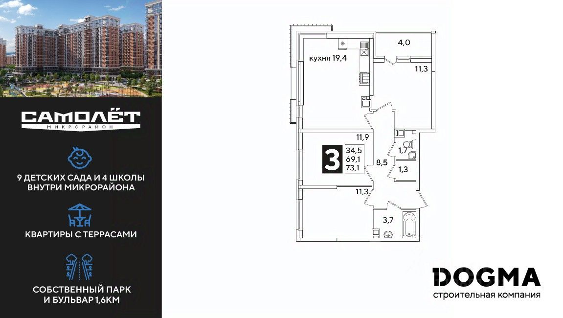 DOGMA - ТОП-3 застройщик по объему строительства в РФ. "САМОЛЁТ" — концептуальный жилой микрорайон, который расположен на северо-западе Краснодара, в районе Западного Обхода. Квартал спроектирован как "город в городе", поэтому здесь будет всё для комфортной жизни: современные дома с разными планировками, дороги, школы и детские сады, поликлиника, торговые центры, парки и аллеи. Микрорайон находится далеко от промышленных предприятий, сочетает удобство городской жизни и экологически благоприятную среду. Инфраструктура нового микрорайона: • 4 школы и 9 детских садов на территории микрорайона • Функциональные планировки • Собственный бульвар протяжённостью 1,6км • Светомузыкальный фонтан протяжённостью 55 метров • Амфитеатр • Парк 7 ГА • Скейт-парк • Детская аква-площадка • Круглосуточное видеонаблюдение и пост охраны Приобрести квартиру можно одним из способов: ипотека, рассрочка, наличный расчет.